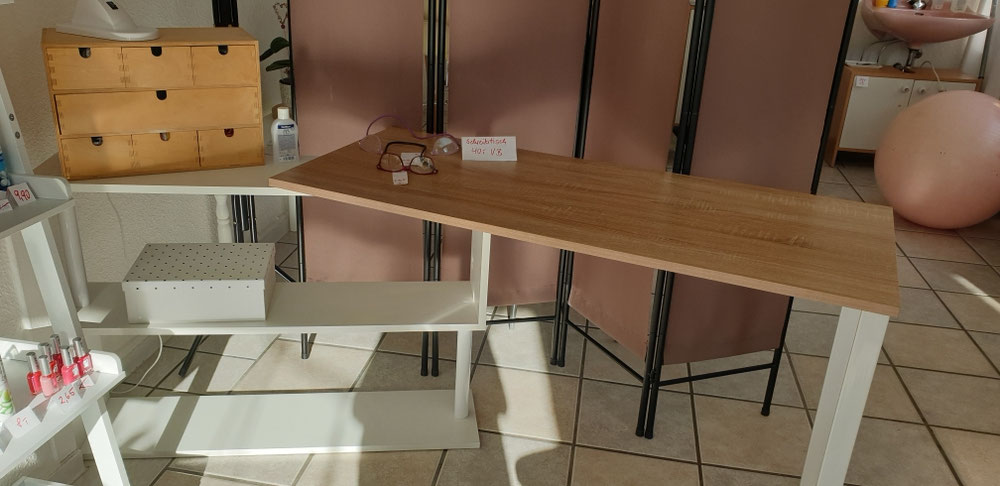 Regal: 180 cm hoch 55 cm breit, Schubladen 28 cm tief, 6,5 cm hoch. 1. Regal 15 cm tief, 2. 20 cm